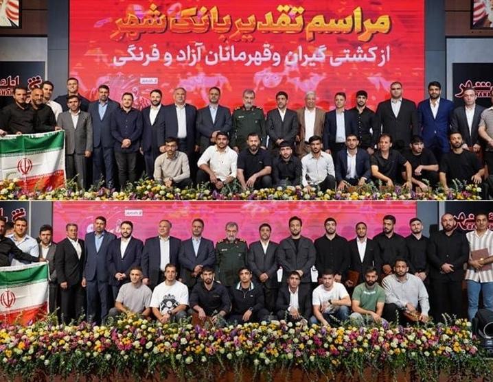 به گزارش خبرگزاری تسنیم به نقل از روابط عمومی بانک شهر، در این مراسم که سردار سرلشکر محسن رضایی فرمانده سپاه پاسداران در دوران دفاع مقدس، سید شمس الدین حسینی رئیس کمیسیون اقتصادی مجلس، احمد نادری عضو هیات رئیسه مجلس، رضا جباری نایب رئیس کمیسیون بهداشت و درمان مجلس، سید نجیب حسینی نماینده مردم شرق استان گلستان، دکتر سیدمحمدمهدی احمدی مدیرعامل بانک شهر، علیرضا دبیر رئیس فدراسیون کشتی و ... حضور داشتند، از تیم های ملی کشتی آزاد و فرنگی که اخیرا در رقابتهای جهانی 2025 کرواسی به عنوان قهرمانی دست یافتند، تقدیر به عمل آمد.