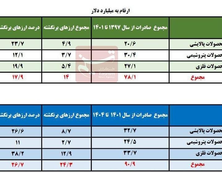 بر اساس این آمار، طی سالهای 1401 تا 1404، محصولات پالایشی با صادرات 32.7 میلیارد دلار بوده که 8.7 میلیارد دلار ارز را برنگرداندند، که این مقدار معادل حدود 26.6 درصد می شود. صادرات پتروشیمی نیز با مجموع 24.5 میلیارد دلار، 2.7 میلیارد دلار بازگشت ارز نداشته که معادل 11 درصد از کل ارز صادراتی این بخش است که برنگشته است. در همین مدت، محصولات فلزی با صادرات 33.7 میلیارد دلار، 12.9 میلیارد دلار از منابع ارزی خود را بازنگرداندهاند؛ یعنی 38.2 درصد از کل ارز صادراتی این گروه.