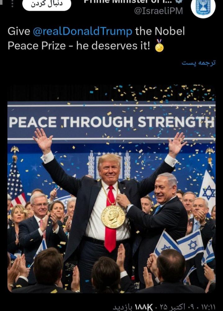 اقتصاد ایران: صفحه رسمی نخست وزیر رژیم صهیونیستی، با انتشار تصویری ساخته شده با هوش مصنوعی، خواستار اهدای جایزه صلح نوبل به ترامپ شد.