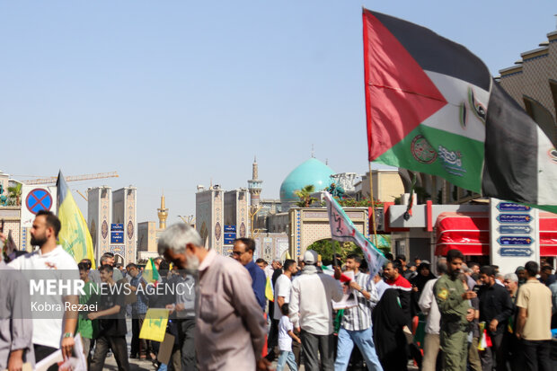 این مراسم از باب‌الجواد(ع) حرم مطهر امام رضا(ع) آغاز و با تجمع مردم در چهارراه شهدا همراه بود. شرکت‌کنندگان با در دست داشتن پرچم‌های فلسطین و شعارهای «القدس لنا»، «مرگ بر آمریکا» و «مرگ بر اسرائیل» بر تداوم مسیر مقاومت تا آزادی قدس شریف تأکید کردند.