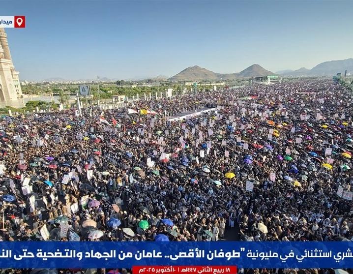 به گزارش گروه بین الملل خبرگزاری تسنیم، قشرهای مختلف مردم یمن امروز در تظاهرات باشکوهی در صنعاء با عنوان «طوفان الاقصی، دو سال جهاد و جانفشانی تا پیروزی» با تبریک به مردم فلسطین و مقاومت آن به سبب پیروزی بر رژیم صهیونیستی در جنگ نسل کشی دوساله تاکید کردند که رژیم صهیونیستی درتحقق اهداف خود شکست مفتضحانهای متحمل شد.