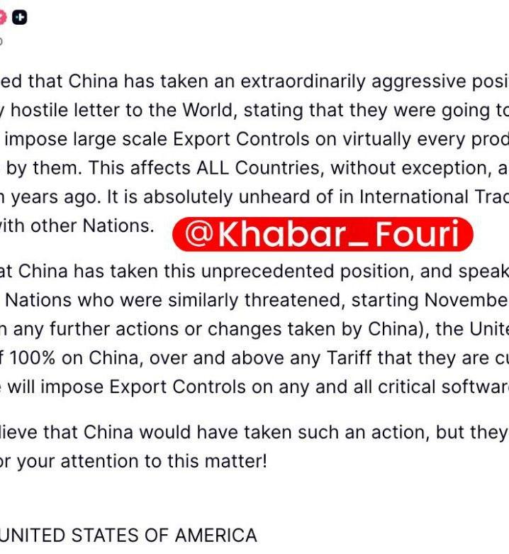 ترامپ روز جمعه در پستی در شبکه اجتماعی تروث سوشال نوشت: بهتازگی مطلع شدهایم که چین با ارسال نامهای بهشدت خصمانه به جهان، موضعی فوقالعاده تهاجمی در قبال تجارت اتخاذ کرده و اعلام کرده که از اول نوامبر ۲۰۲۵، کنترلهای صادراتی گستردهای را تقریبا بر هر محصولی که تولید میکند و برخی کالاهایی که تولید نکرده، اعمال خواهد کرد.