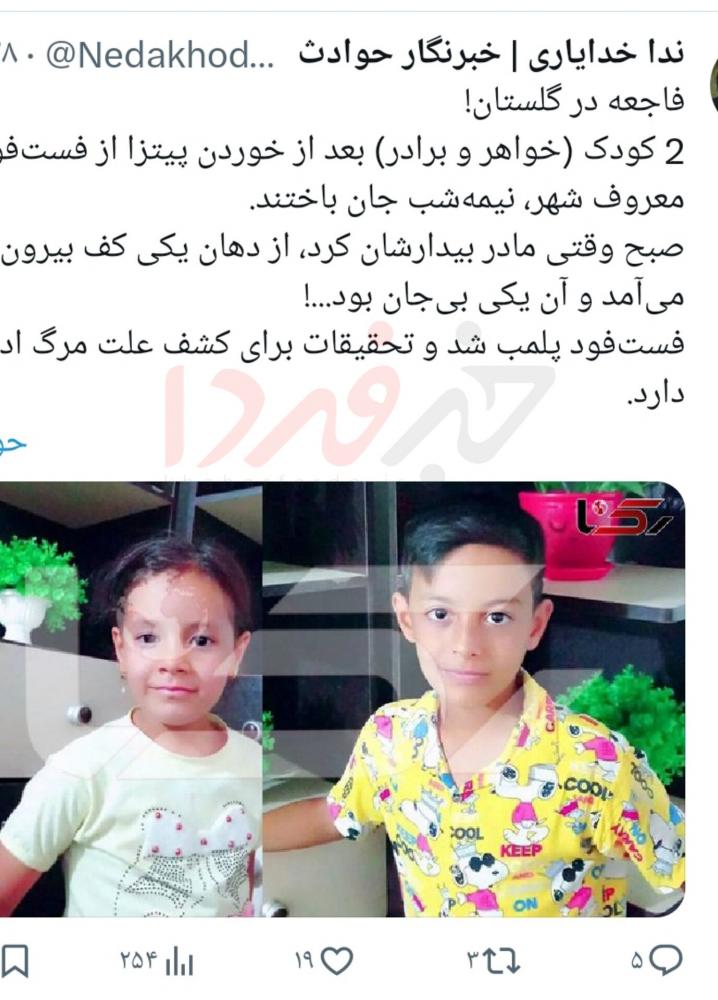 رکنا: ندا خدایاری (خبرنگار حوزه حوادث) با انتشار توئیتی خبر از یک اتفاق هولناک در استان گلستان داد. او نوشت» فاجعه در گلستان! ۲ کودک (خواهر و برادر) بعد از خوردن پیتزا از فستفود معروف شهر، نیمهشب جان باختند. صبح وقتی مادر بیدارشان کرد، از دهان یکی کف بیرون میآمد و آن یکی بیجان بود...! فستفود پلمب شد و تحقیقات برای کشف علت مرگ ادامه دارد.
