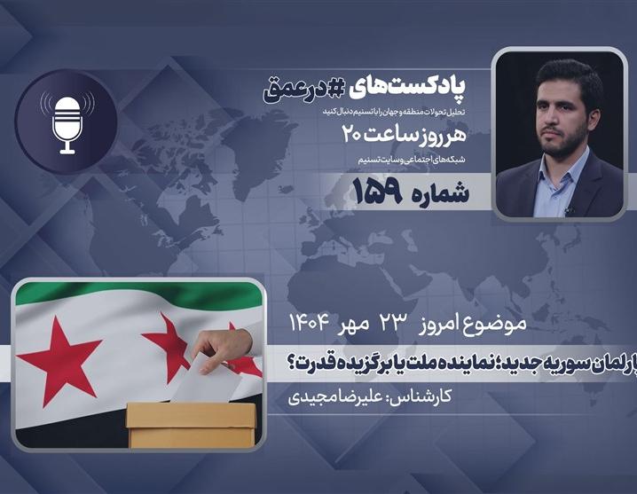 گروه بینالملل خبرگزاری تسنیم ـ یکصدوپنجاه و نهمین شماره از پادکست «در عمق» که به بررسی مهمترین روندها، تحولات و همچنین شخصیتها در غرب آسیا میپردازد، روز چهارشنبه 23 مهر 1404 ضبط و منتشر شد. در این اپیزود «علیرضا مجیدی»، کارشناس مسائل غرب آسیا به نخستین انتخابات پارلمانی در سوریه پس از سقوط بشار اسد را بررسی میکند.