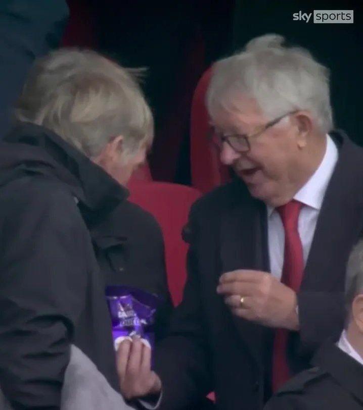 در این تصویر، فرگوسن در حال تعارف شکلات به دالگلیش است. هواداران این دو تیم اما این تصویر را باور نمیکنند و معتقدند نباید اینگونه میشد و این دو باید در حال بحث و جدل با هم میبودند نه خنده و شکلات خوری!