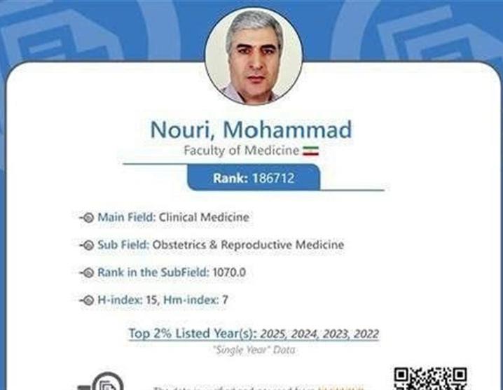 به گزارش گروه اجتماعی خبرگزاری تسنیم، براساس آخرین بهروزرسانی پایگاه داده علمسنجی وابسته به تیم پژوهشی دانشگاه استنفورد، دکتر «محمد نوری» برای چهارمین سال متوالی در فهرست پژوهشگرانی قرار گرفته است که از نظر شاخصهای علمی، در میان دو درصد پژوهشگران دارای بیشترین اثرگذاری استنادی در رشته تخصصی خود محسوب میشوند.