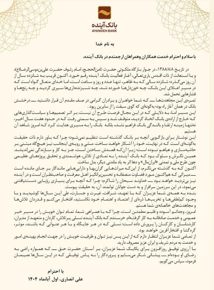 برترینها: علی انصاری با انتشار متنی نسبت به انحلال بانک آینده واکنش نشان داد.