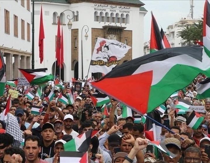 شهروندان مغرب با تجمع در مقابل پارلمان این کشور فریاد زدند« ما ضد اشغالگری هستیم» . آنان پلاکاردهایی در دست داشتند که بر روی برخی آنها نوشته شده بود: « فلسطین آزاد باید گردد» و « مقاومت تا آزادی فلسطین».
