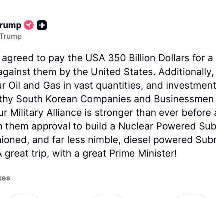 به نقل از شبکه خبری ان بی سی، ترامپ در رسانه اجتماعی خود موسوم به تروث سوشال نوشت: کرهجنوبی توافق کرده است که ۳۵۰ میلیارد دلار به ایالات متحده بپردازد تا تعرفههای وضعشده علیه این کشور کاهش یابد.