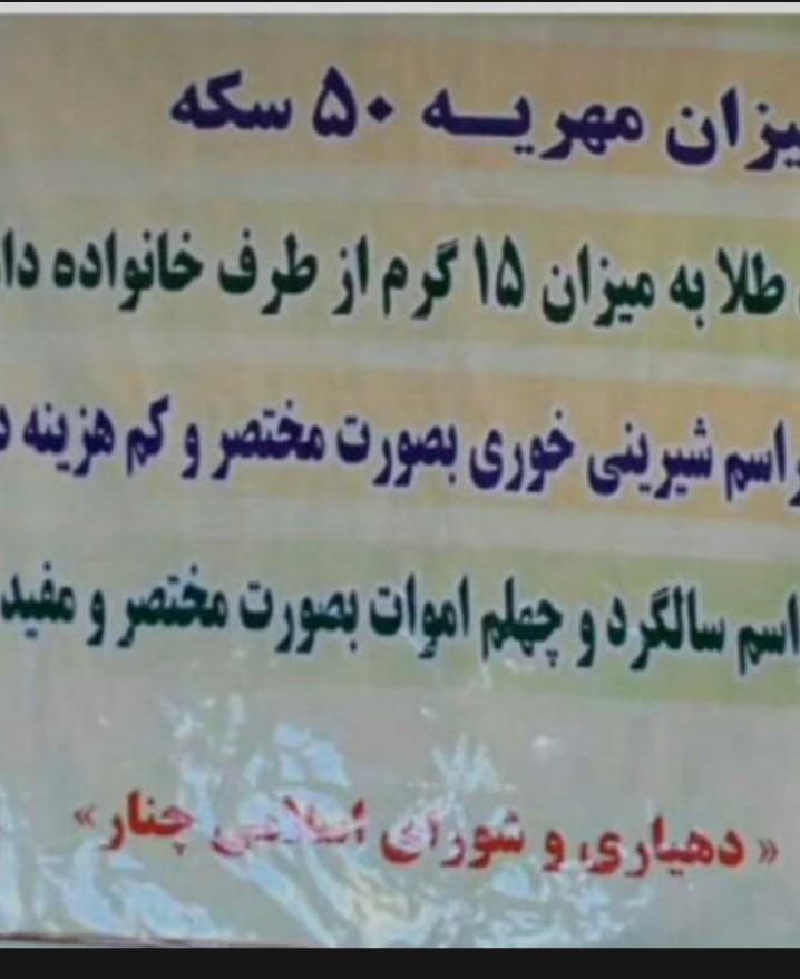 اهالی روستای چنار در شهرستان خلخال با هدف تسهیل ازدواج جوانان، طرحی را به اجرا گذاشتهاند که بر اساس آن مهریهای ثابت برای بانوان و همچنین میزان مشخصی از طلا بهعنوان هدیه خانواده داماد به عروس تعیین شده است.