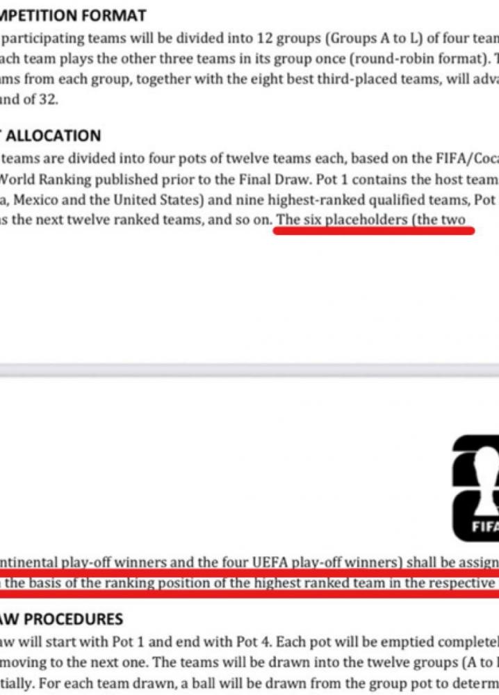 اما طبق قانون فیفا همچنان میتواند مانند گذشته عمل کرده و تمام تیمهای پلیآف را در گلدان چهارم قرار دهد. در این صورت چه اتفاقی رخ خواهد داد؟ این سند منتشر شده است که چند خبرنکار مدعی هستند فیفا آن را به فدراسسونهای عضو ارسال کرده است. بر این اساس تیمهای پلی اف لزوما در سید چهارم قرار نخواهند گرفت.