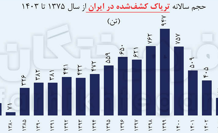 طبق بررسی فرهیختگان، کشفیات تریاک که در سال ۱۳۹۹ به ۹۴۷ تن رسیده بود، در ۱۴۰۳ به ۲۰۹ تن سقوط کرده که ۶۳ درصد افت نسبت به میانگین دو دهه اخیر (۵۶۰ تن) است.