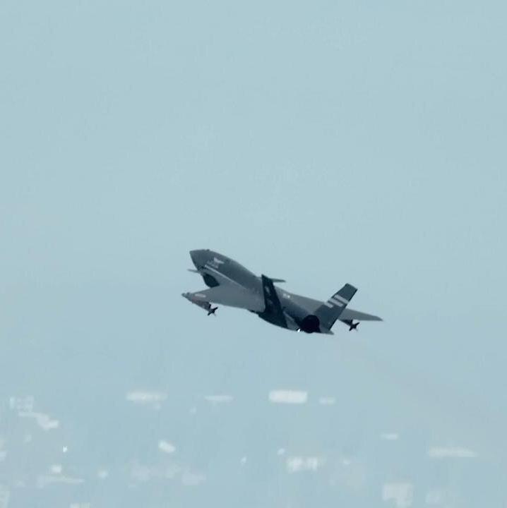تصویر هوایی از جنگنده بدونسرنشین «قزلالما» متعلق به شرکت بایکَر، هنگام آزمایش تسلیحاتی با بمب هدایتشونده TEBER-82 ساخت راکتسان، در دوم اکتبر ۲۰۲۵ ثبت شده است.