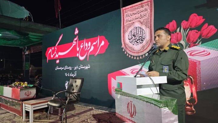 فرمانده سپاه سیدالشهدا شهرستان دیر، با تأکید بر نقش شهدا در تثبیت ارزشهای انقلاب و تداوم وحدت ملی، گفت: شهید با آمدنش به ما میگوید هنوز صدایش میزنند و آمادهایم تا جان تازهای به راه او ببخشیم.