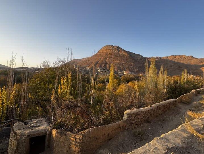 از بالای بام یکی از خانهها که مینگری، چشماندازی تماشایی پیش رؤیت است: خانههای گِلی و آجری که بر شیب تپهها بنا شدهاند، با سقفهایی صاف و دودکشهایی کوتاه. در پاییندست، باغها همچون فرشی زرد و سبز گسترده شدهاند و در دوردست، کوههای سرخ و خاکی، قامت استوارشان را در برابر آسمان آبی برکشیدهاند.