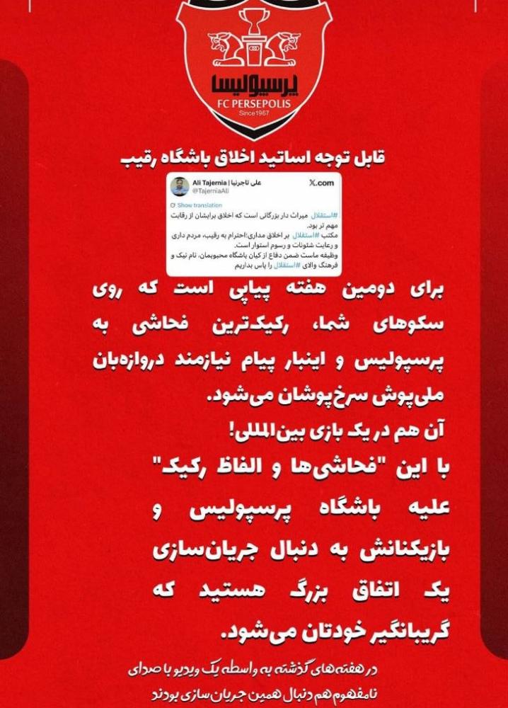 با این “فحاشی‌ها و الفاظ رکیک” علیه باشگاه پرسپولیس و بازیکنانش به دنبال جریان‌سازی یک اتفاق بزرگ هستید که گریبانگیر خودتان می‌شود.