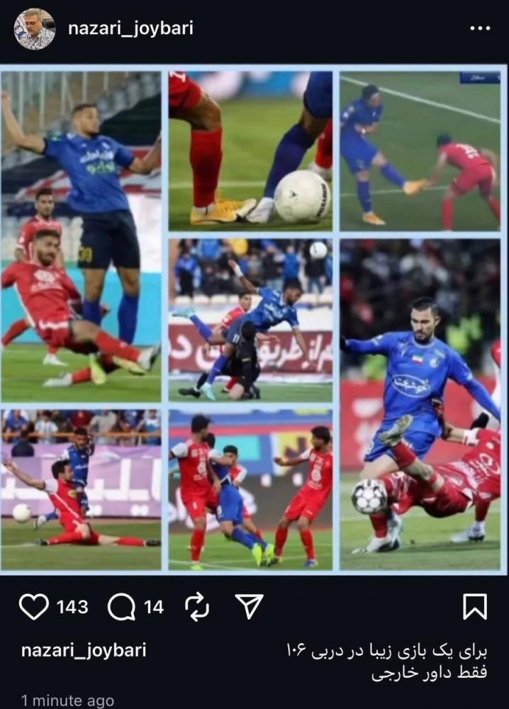 علی نظریجویباری، عضو هیاتمدیره باشگاه استقلال دیشب با انتشار تصویری از صحنههای مشکوک دربی در سالهای اخیر، خواستار انتخاب داور خارجی برای این مسابقه شد.