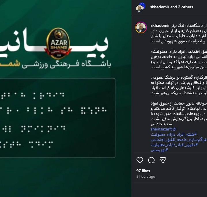 برترینها: خادمی، مشاور سازمان بهزیستی در پستی و با انتقاد از بیانیه اعتراضی باشگاه شمسآذر با خط بریل نوشت: «هیچ ویژگی انسانی نباید تبدیل به ابزار طعنه، توهین یا تمسخر شود. معلولیت نقیصه نیست، تنوع زیستی میلیونها انسان است.»