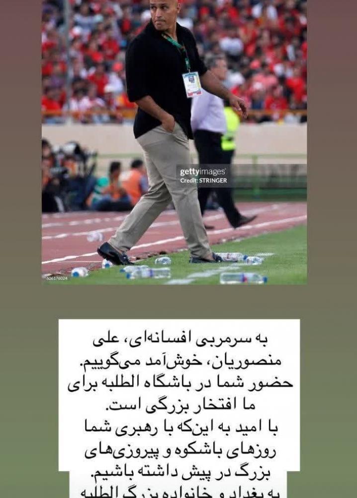 صبح امروز نیز صفحه رسمی باشگاه الطلبه با انتشار پستی به زبان فارسی، ضمن خوشآمدگویی به منصوریان نوشت: حضور شما در باشگاه الطلبه برای ما افتخاری بزرگ است.