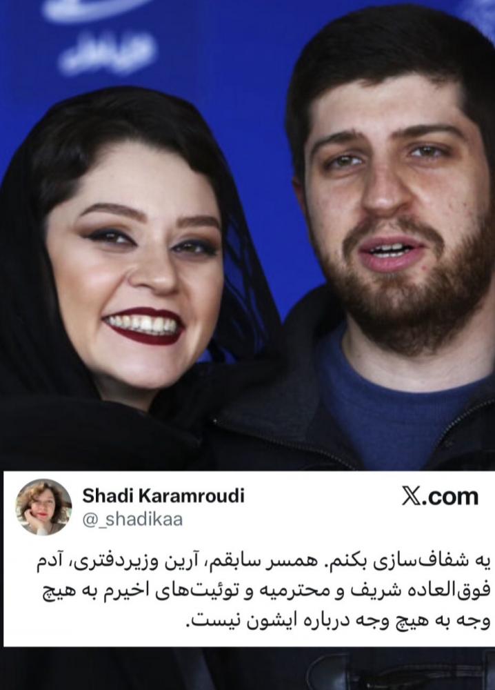 در همین خصوص چند روز پیش شادی کرم رودی یک توئیت درباره خیانت منتشر کرد که باعث برخی گمانهزنیها درباره علت جدایی او شد. اما او با انتشار یک توئیت جدید درباره همسر سابقش شفافسازی کرد.