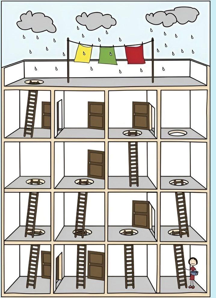 به پازل تصویری پایین خوب نگاه کنید. یک تصویر از ساختمان چند طبقه را نشان می دهد که دارای پله هایی از طبقه ای به طبقه دیگر و درهایی است که اتاق های مختلف را به هم متصل می کند. در بالای ساختمان، یک پشت بام با بند رخت وجود دارد که در آن سه تکه لباس رنگارنگ – یکی زرد، یکی سبز و دیگری قرمز – در حالی که باران می بارد، آویزان شده است.