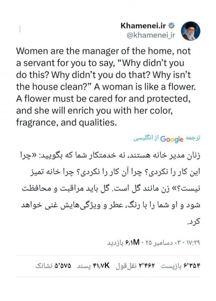 مورد ویژه توییت انگلیسی حساب رهبر انقلاب درباره زنان
