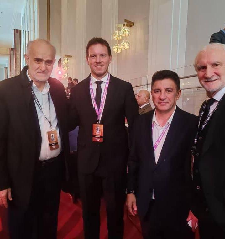 اقتصاد ایران: عکس یادگاری امیر قلعهنویی و محمد نبی با ناگلزمن، سرمربی و مدیر تیم ملی آلمان در جریان قرعهکشی جامجهانی ۲۰۲۶.