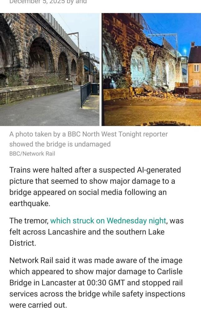 اقتصاد ایران: پس از انتشار تصویری در شبکههای اجتماعی که خسارت شدید به پل کارلایل در لنکستر را نشان میداد و ظاهراً با هوش مصنوعی تولید شده بود، حرکت قطارها در این مسیر متوقف شد.