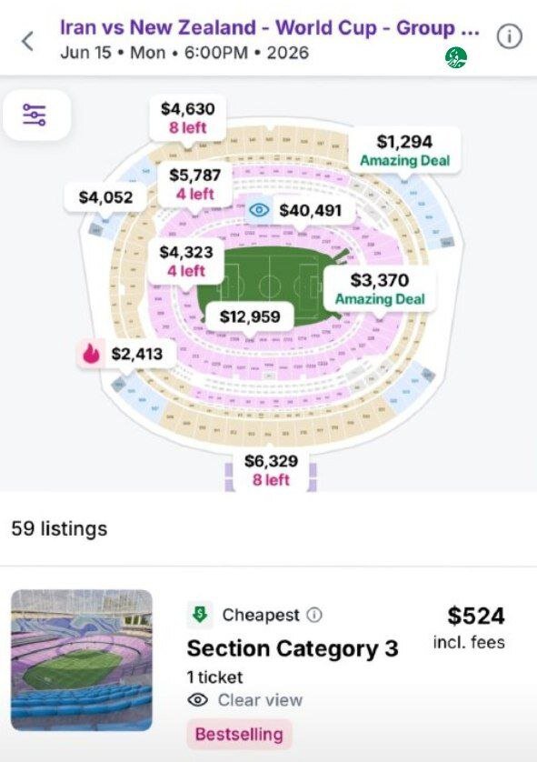 برای دیدار ایران – نیوزیلند که روز ۱۵ ژوئن ۲۰۲۶ برگزار میشود، پایینترین قیمت مربوط به بلیتهای Category ۳ است که بین ۴۵۲ تا ۵۲۴ دلار (با احتساب هزینهها) عرضه میشود. این بلیتها بهصورت «رزرو ناحیه» فروخته میشوند و صندلی دقیق هنگام صدور نهایی مشخص خواهد شد. در سایر بخشهای ورزشگاه، قیمتها از سطح ۱۲۹۴ دلار آغاز شده و تا بیش از ۴۰ هزار دلار در بخشهای VIP افزایش مییابد. بخشهای نزدیک به زمین نیز در محدوده ۳۰۰۰ تا ۶۰۰۰ دلار قیمتگذاری شدهاند.