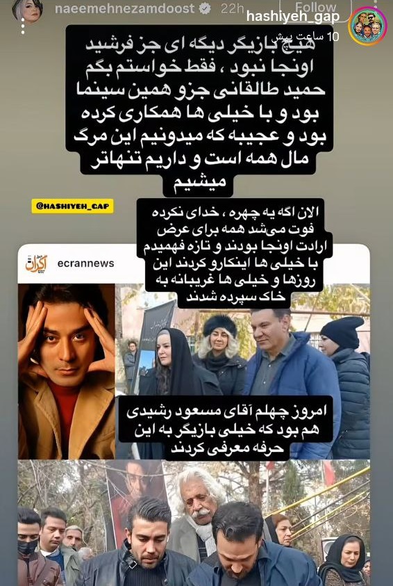 اقتصاد ایران: نعمیه نظامدوست با انتشار یک استوری از غایبین مراسم خاکسپاری حمید طالقانی انتقاد کرد.