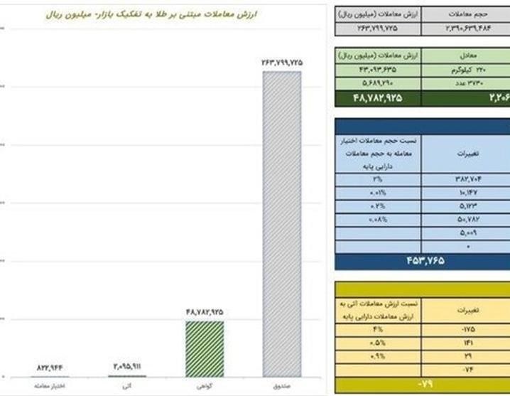 همچنین 3 هزار و 958 قرارداد آتی مبتنی بر طلا به ارزش 209 میلیارد تومان مورد معامله قرار گرفت. در قراردادهای آتی شاهد کاهش 79 موقعیت در مجموع موقعیت های باز قراردادهای مبتنی بر طلا بودیم.