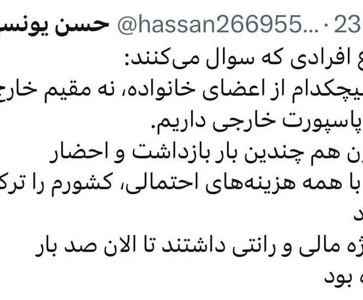 اقتصاد ایران: حسن یونسی نوشت: جهت اطلاع افرادی که سوال میکنند: نه من، نه هیچکدام از اعضای خانواده، نه مقیم خارج هستیم، نه پاسپورت خارجی داریم.