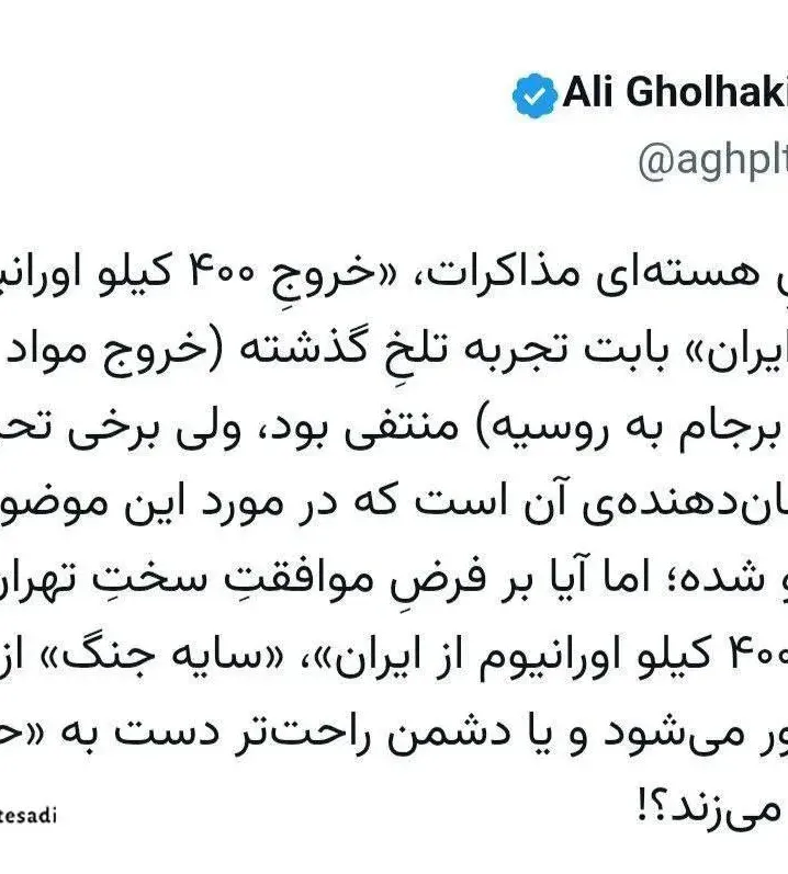 اقتصاد ایران: علی قلهکی، فعال رسانهای اصولگرا، تلویحا از احتمال موافقت سخت تهران با پیشنهاد ترامپ مبنی بر خروج ۴۰۰ کیلو اورانیوم غنی شده از کشور خبر داد.