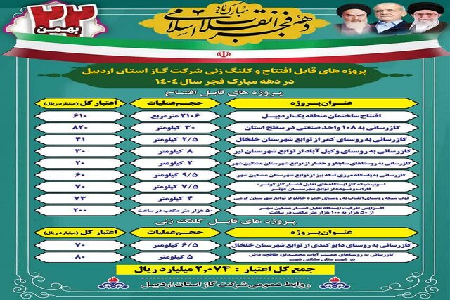 معرفت خدابنده ۱۴ بهمن در جمع خبرنگاران گفت: این پروژهها شامل گازرسانی به ۱۰۸ واحد صنعتی گازرسانی به روستاهای کمر در شهرستان خلخال، روستاهای وکیل آباد در شهرستان نیر، روستای ساچلو و حصار در شهرستان مشگین شهر و گازرسانی به پاسگاه مرزی لنگه بیز است.
