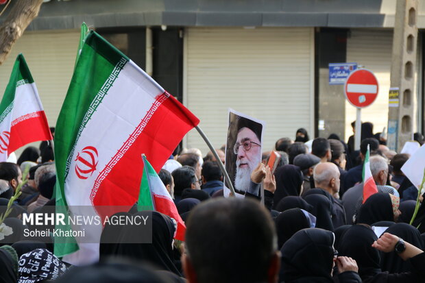 مردم از جای جای خیابان درحال عبور هستند مادری همراه دختر کوچک خود پرچم به دست در گفتوگو با خبرنگار مهر اظهار کرد: در این راهپیمایی عظیم شرکت کردیم که با مشتمون بزنیم تو دهنت آمریکا و بگوییم که تا پای جان پای ایران هستیم.