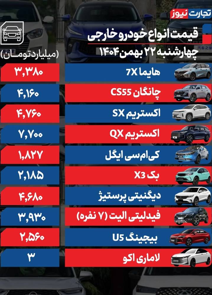 قیمت خودرو در بازار آزاد امروز 22 بهمن 1404