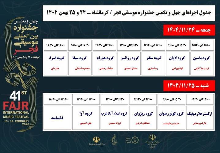 به گزارش خبرنگار مهر، مظفر تیموری در جمع خبرنگاران از اعلام جدول اجراهای چهلویکمین جشنواره موسیقی فجر در کرمانشاه خبر داد و اظهار داشت: اجراهای این دوره از جشنواره در روزهای ۲۴ و ۲۵ بهمنماه برگزار میشود و تلاش شده با برنامهریزی منسجم، زمینه حضور حداکثری هنرمندان و علاقهمندان موسیقی فراهم شود.