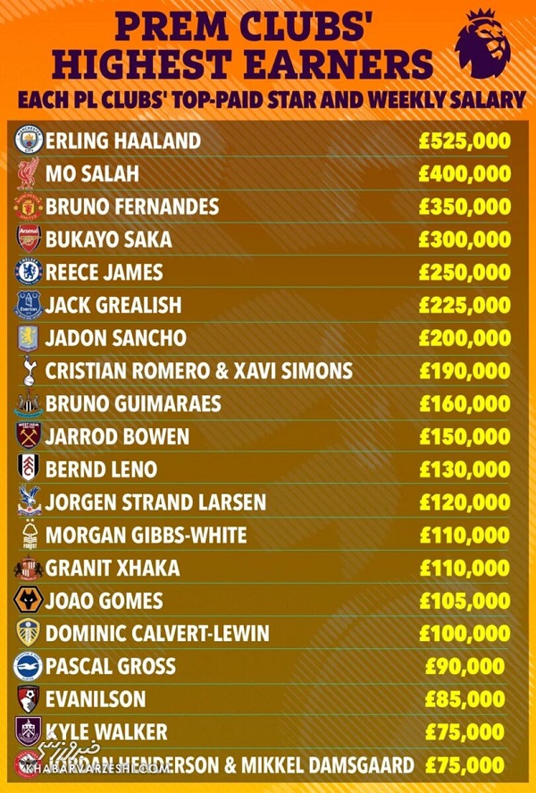 و در پایان جدول، برنلی با کایل واکر و برنتفورد با دو بازیکن خود، جردن هندرسون و میکل دامسگارد حضور دارند که هر سه بازیکن ۷۵,۰۰۰ پوند در هفته حقوق میگیرند.