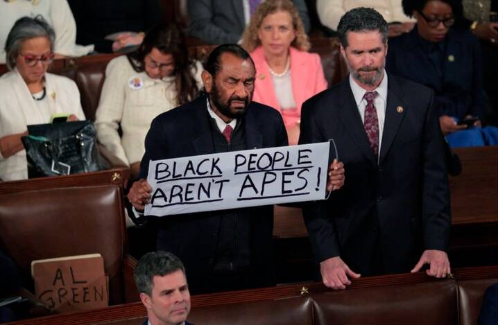 به گزارش خبرگزاری مهر به نقل از سی ان ان، ال گرین نماینده دموکرات کنگره آمریکا که پلاکارد «سیاه پوستان میمون نیستند» را در مراسم سخنرانی دونالد ترامپ رئیس جمهور آمریکا در مجلس نمایندگان این کشور در دست داشت، دقایقی پس از آغاز سخنرانی از جلسه اخراج شد.