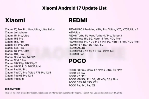 در این فهرست نامهای بزرگی از خانواده پرچمداران تا میانردههای محبوب به چشم میخورد. سری شیائومی ۱۵ و ۱۴ در کنار مدلهای شیائومی ۱۳ و تی ۱۳ در صدر این لیست قرار دارند. همچنین گوشیهای پرفروش ردمی نوت ۱۳ و نوت ۱۴ در کنار مدلهای اقتصادیتر سری ردمی ۱۲ و ۱۳ نیز برای دریافت آپدیت اندروید ۱۷ برای شیائومی تایید شدهاند. کاربران برند پوکو هم فراموش نشدهاند و سریهای X و F از جمله پوکو X6 و F6 در این برنامه حضور دارند.