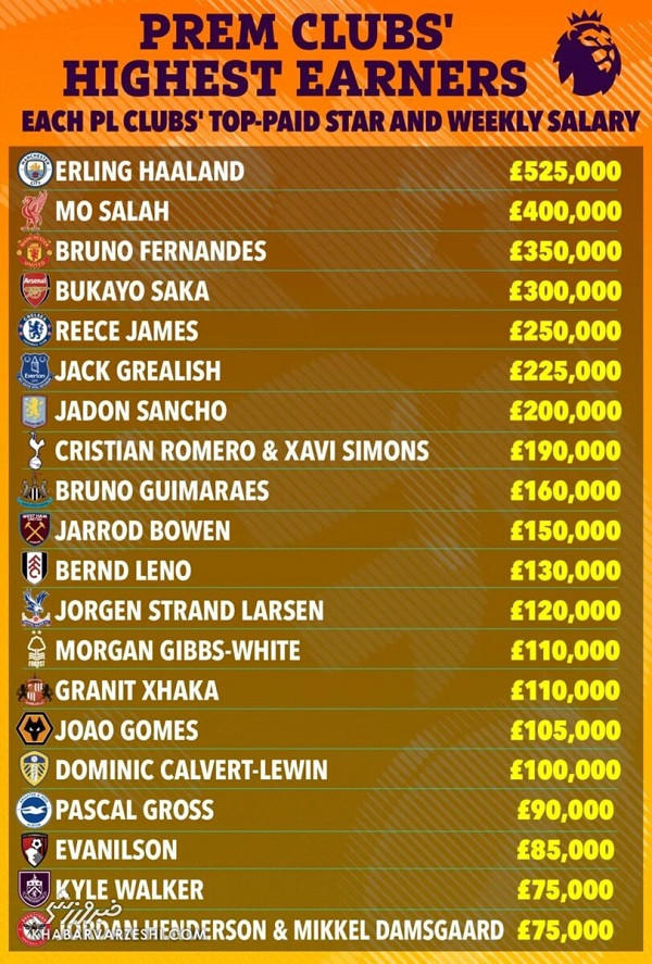 و در پایان جدول، برنلی با کایل واکر و برنتفورد با دو بازیکن خود، جردن هندرسون و میکل دامسگارد حضور دارند که هر سه بازیکن ۷۵,۰۰۰ پوند در هفته حقوق میگیرند.